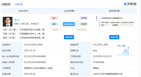 天眼查顯示,泡泡瑪特的主體(tǐ)公司為(wèi)北京泡泡瑪特文化創意有(yǒu)限公司,公司成立于2010年10月20日,注冊資本為(wèi)1.1545億元,公司法定代表人(rén)為(wèi)泡泡瑪特的創始人(rén)和(hé)董事長王甯。